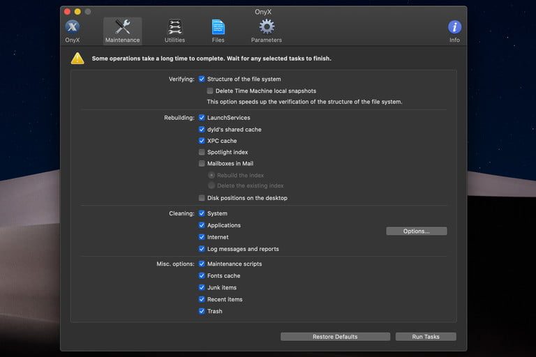 ¿Nada de esto funcionó? Pues quizá es el momento de OnyX. Se trata de una aplicación gratuita que ejecuta todo tipo de optimizaciones centradas en Mac. Descarga la versión apropiada para su sistema, instálala y comieza. Es una herramienta poderosa para el usuario, aunque probablemente no debería ser usada por alguien que no se sienta cómodo con ella.
