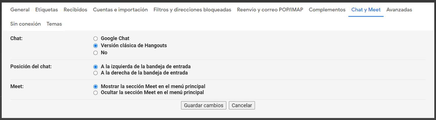 En el menú superior, debes seleccionar la opción Chat y Meet y marcar la casilla que dice Google Chat (en lugar de Versión clásica de Hangouts). Después, haz clic en Guardar cambios, y espera a que Gmail recargue su página.