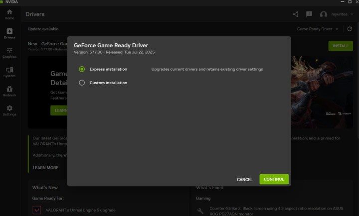 Para la mayoría de los usuarios, recomendamos la instalación Express. Haga clic en eso y el controlador comenzará a instalarse. Windows puede solicitarle permisos adicionales, así que presione para otorgarlos.