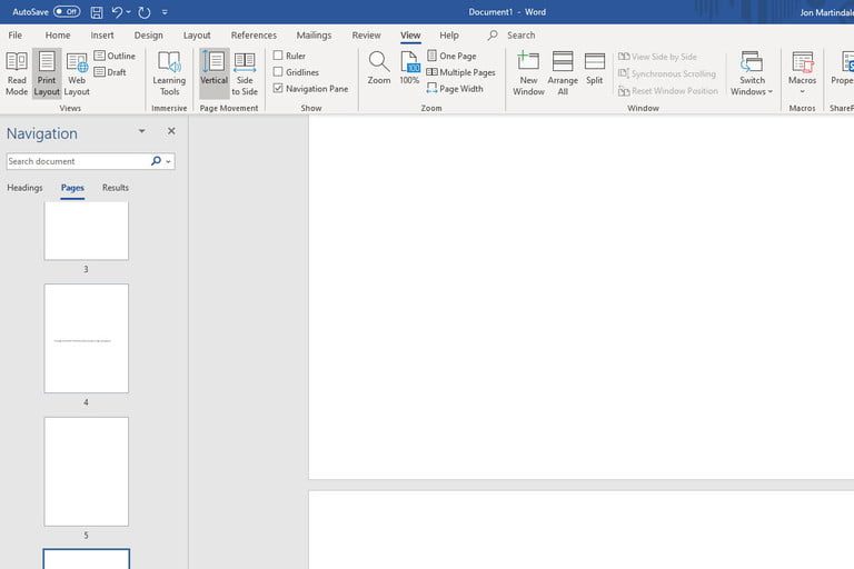 Paso 1: para encontrar las páginas en blanco, abriremos el Panel de navegación. Puedes hacerlo al seleccionar Ver en el menú superior y luego asegurarte de que la casilla Panel de navegación esté marcada. Esto debería abrir una nueva columna en el lado izquierdo que muestra todas las páginas de tu documento. Si no es así, asegúrate de seleccionar la pestaña Páginas en él.