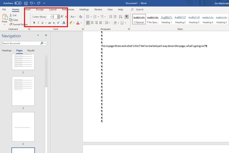 Paso 4: haz clic y arrastra para seleccionar todas las marcas de párrafo y presiona la tecla Eliminar para borrarlas así como la página en blanco. Alternativamente, si solo tienes unas pocas marcas de párrafo y deseas moverlas a la última página, puedes seleccionarlas todas y cambiar el tamaño de fuente al volver a la pestaña Inicio en la barra superior y escribir “1” en el cuadro de tamaño de fuente, luego presiona Entrar.