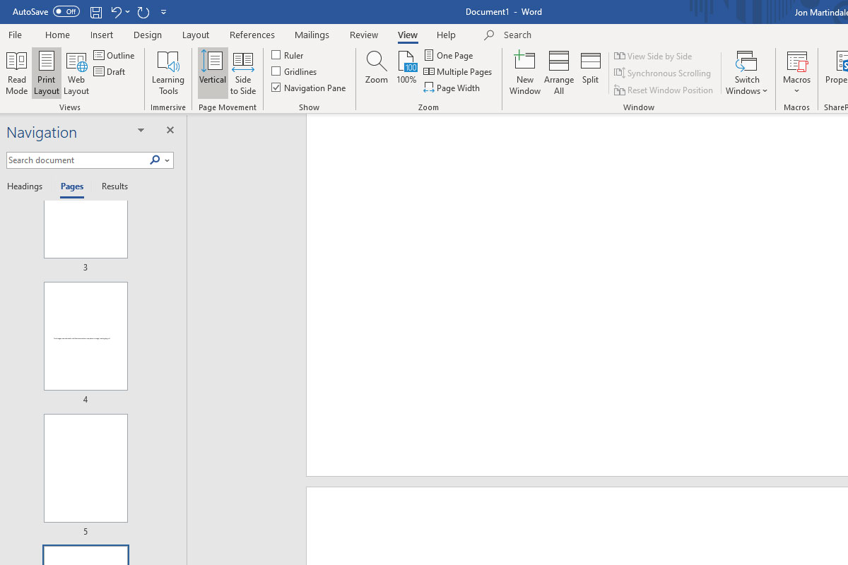 Paso 1: para encontrar las páginas en blanco, abriremos el Panel de navegación. Puedes hacerlo al seleccionar Ver en el menú superior y luego asegurarte de que la casilla Panel de navegación esté marcada. Esto debería abrir una nueva columna en el lado izquierdo que muestra todas las páginas de tu documento. Si no es así, asegúrate de seleccionar la pestaña Páginas en él.