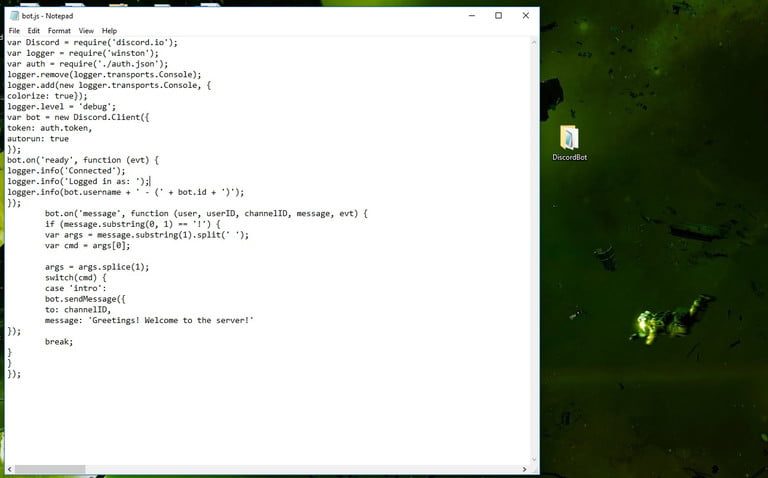 Necesitarás un tercer archivo, vital para el comportamiento de tu bot. Deberás estar familiarizado con JavaScript para tener un control total del bot, pero si eres nuevo en la codificación y solo quieres hacer algo simple, puedes copiar y pegar este código para hacer un simple bot que saludará en tu servidor.