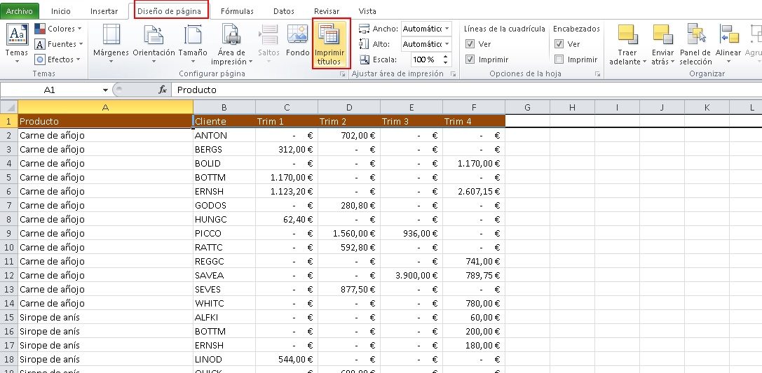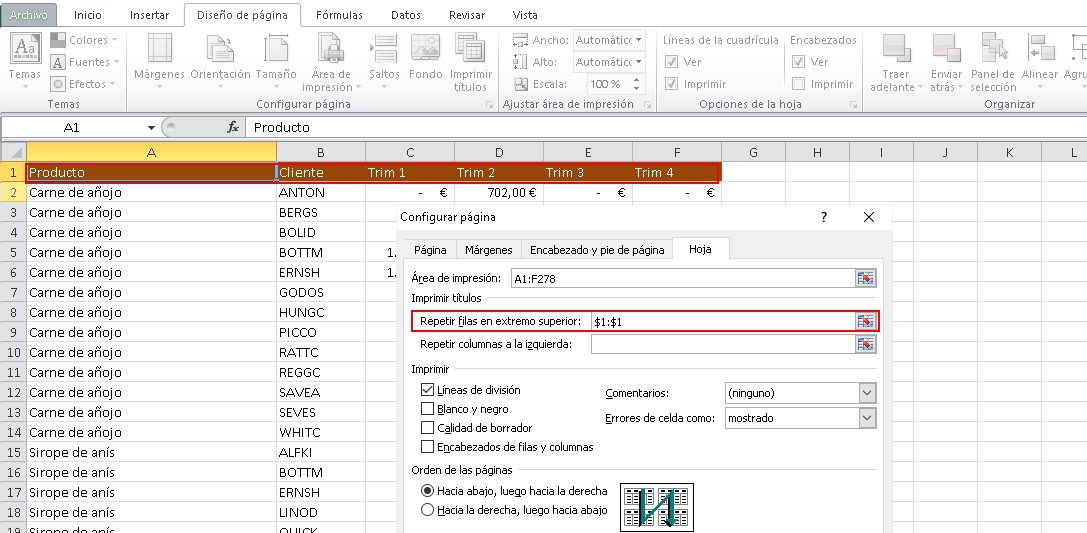 Si necesita más de una hoja para la impresión de tus documentos, es probable que desees conservar los encabezados de las filas o las columnas para que la información sea reconocida rápidamente por cualquier persona. En el ejemplo, especificamos que la fila 1 donde están los títulos de “Nombre de productos”, “Clientes” y precios por trimestre aparezcan en todas las hojas.