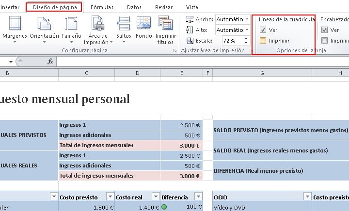 Ocultar (o mostrar) las cuadrículas en la impresión