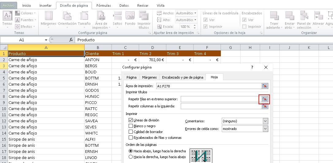 Si necesita más de una hoja para la impresión de tus documentos, es probable que desees conservar los encabezados de las filas o las columnas para que la información sea reconocida rápidamente por cualquier persona. En el ejemplo, especificamos que la fila 1 donde están los títulos de “Nombre de productos”, “Clientes” y precios por trimestre aparezcan en todas las hojas.