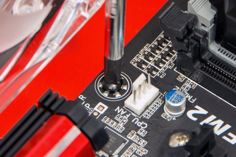 Tienes que alinear los hoyos para tornillos en la tarjeta con los espaciadores que ya colocaste. Asegúrate de que también encaje bien en la placa trasera y de que ninguna pieza de metal cubra algún puerto.
