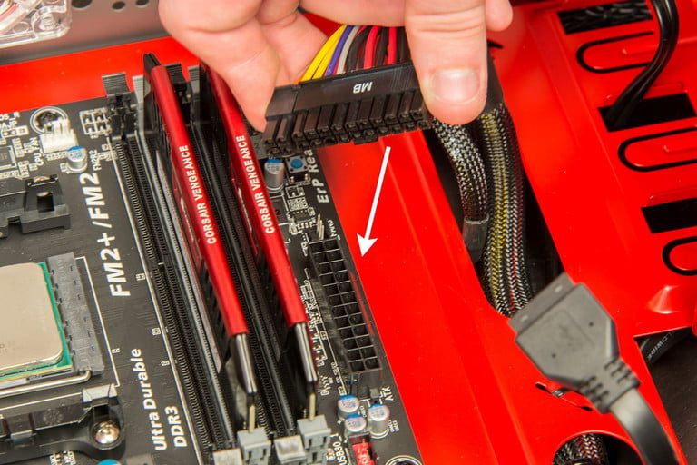 Lleva los cables a sus lugares por donde prefieras e insértalos en su respectiva ranura presionándolos con cuidado, asegurándote de que su orientación sea la correcta. Si no estás seguro, fíjate en la forma de los sockets, pues vienen con forma redonda y cuadrada a propósito para que una entrada incorrecta sea imposible.