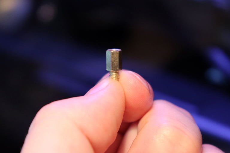 Una tarjeta madre es un equipo electrónico delicado, y debes evitar que entre en contacto directo con el chasis conductor de tu PC. Por eso, antes de instalar la tarjeta madre necesitamos instalar los separadores. Estos son tornillos machos con cabezas hembras que te permiten atornillarles directamente la tarjeta madre. Suelen ser de latón; a veces vienen pintados de negro. Debiste haber recibido algunos en una bolsita junto con tu tarjeta madre o con la caja de tu PC. Muchas cajas los incluyen, aunque no siempre son de la forma o tamaño específicos que necesita la tarjeta madre que usarás.