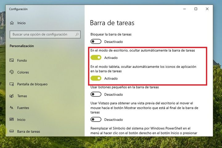 Paso 2: en la página de Configuración que aparece, busca las opciones que dicen Ocultar automáticamente la barra de tareas en el modo de escritorio y Ocultar automáticamente la barra de tareas en el modo de tableta (si corresponde).