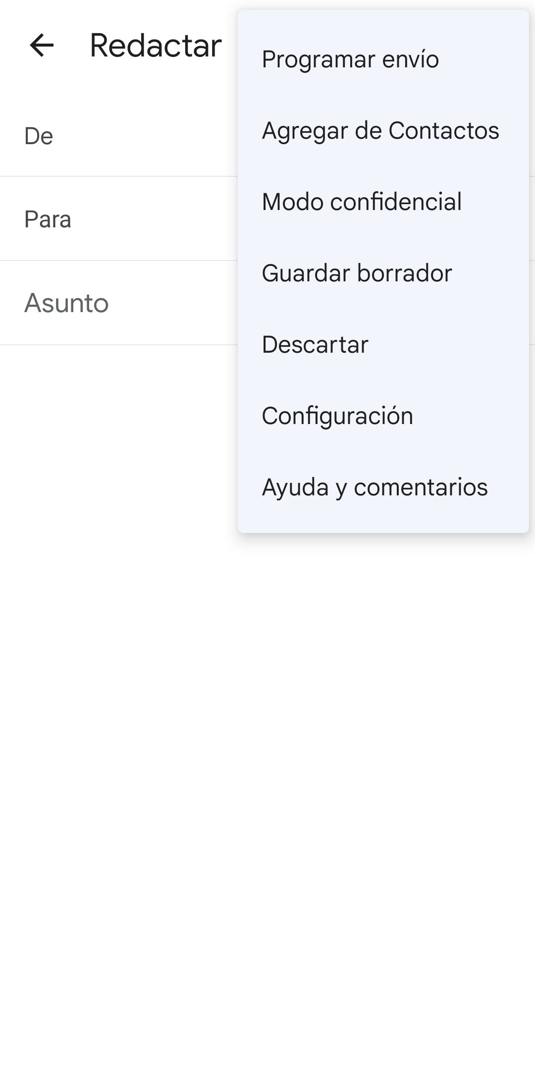 Paso 3: una vez que termines de escribir el correo, toca los tres puntos alineados de forma vertical ubicados en la esquina superior derecha de la pantalla y selecciona Programar Envío en el menú que se desplegará.
