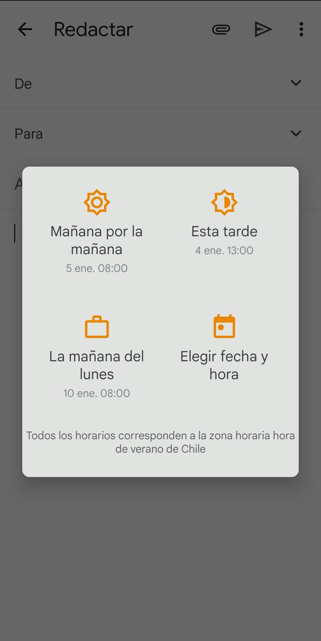 Al igual que en la versión de PC, con la opción Programar envío aparecerá un cartel que te ofrece tres momentos principales del día: “Mañana por la mañana”, “Esta tarde”, “La mañana del lunes”, y una cuarta opción que dice: Elegir fecha y hora. Cuando determines cuándo quieres enviar tu correo, toca el botón Programar envío y listo.