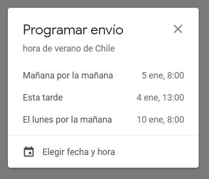Al seleccionar la opción Programar envío, aparecerá un cartel que te ofrece tres momentos principales del día: “Mañana por la mañana”, “Esta tarde” y “El lunes por la mañana”. Pero si esos horarios no te sirven y quieres escoger una hora y día concreto en el que quieres enviar el correo, puedes hacer clic en Elegir fecha y hora.