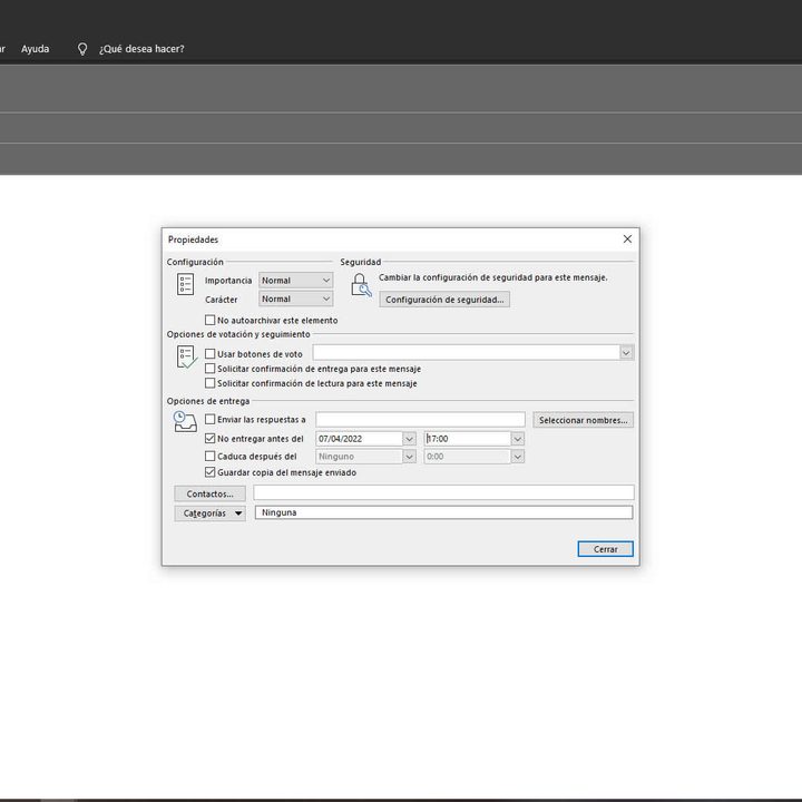 Paso 4: allí, se pueden elegir desde Enviar las respuestas a, así como también dar la opción de enviar mensajes no antes de cierto horario, al igual que su fecha de caducidad o bien guardar una copia del mensaje enviado.