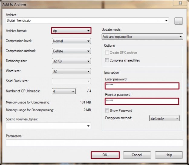 Paso 3: ignorando la mayoría de los ajustes preestablecidos en la ventana emergente resultante, selecciona zip en el menú desplegable directamente al lado de la opción Formato de archivo para asegurarte de que la carpeta sigue siendo compatible en computadoras sin 7-Zip instalado. A continuación, introduce y vuelve a introducir la contraseña deseada para la carpeta en los campos de texto situados en el lado derecho de la ventana. Haz clic en el botón Aceptar cuando termine y permite que la utilidad cree un duplicado comprimido y cifrado de la carpeta que deseas proteger con contraseña.
