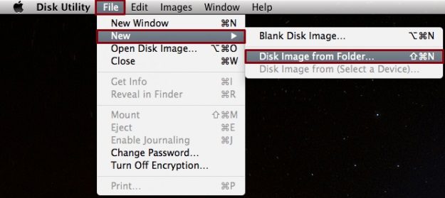 Paso 2: haz clic en Archivo en la barra de herramientas de la aplicación, selecciona Nuevo en el menú desplegable resultante, seguido de Imagen de disco de la carpeta. A continuación, localiza la carpeta que deseas proteger con contraseña examinando la carpeta resultante, resaltándola y haciendo clic en el botón Imagen en la esquina inferior derecha de la ventana.