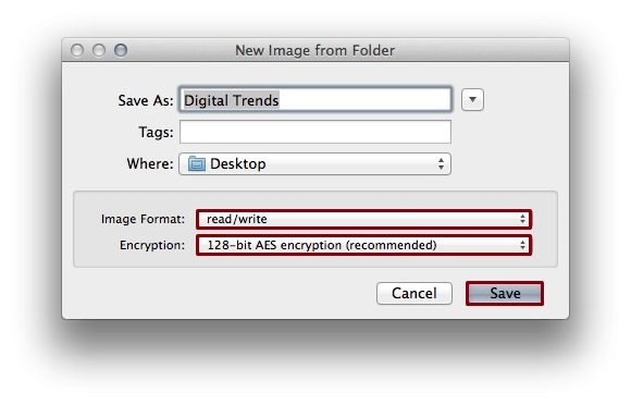 Paso 3: una vez que hayas etiquetado y nombrado los archivos resultantes, selecciona lectura/escritura del menú desplegable directamente a la derecha de la opción Formato de imagen”, seguido de cifrado AES de 128 bits del menú desplegable (directamente a la derecha de la opción Cifrado). Después, elige la ubicación de almacenamiento deseada y haz clic en el botón Guardar en la esquina inferior derecha cuando hayas terminado.