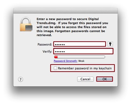 Paso 4: cuando te lo pida, introduce y vuelve a introducir la contraseña deseada en los campos de texto en el centro de la ventana emergente. A continuación, desmarca la casilla directamente a la izquierda de Recordar contraseña en mi llavero y haz clic en el botón “Aceptar” en la parte inferior derecha de la ventana.