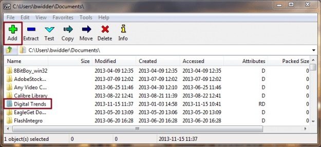 Paso 2: localiza la carpeta que deseas proteger con contraseña dentro de la interfaz principal de 7-Zip y haz clic en el signo de adición verde en la esquina superior izquierda de la aplicación. Como alternativa, arrastra y suelta la carpeta en cualquier lugar dentro de la interfaz principal de 7-Zip.