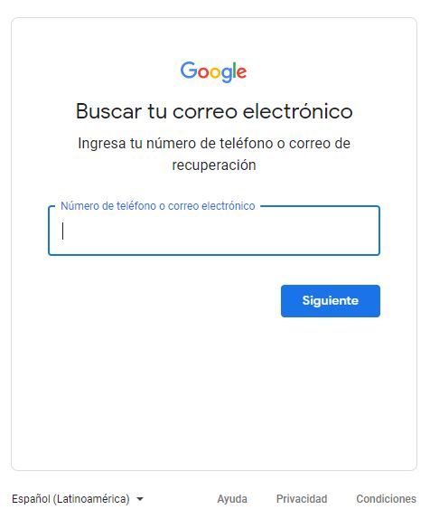 Paso 1: tenemos que visitar la página web de Google e ingresar al sitio de recuperación de cuenta. Allí tendremos que introducir nuestra dirección de correo electrónico.