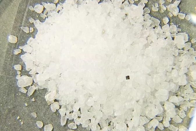 La computadora en sí es minúscula, llegando a 1 milímetro por 1 milímetro de tamaño y, según los informes, tiene aproximadamente la misma potencia de cálculo que una CPU de la década de 1990. Si prestas atención a esta fotografía, podrás verla en el medio de un puñado de granos de sal.