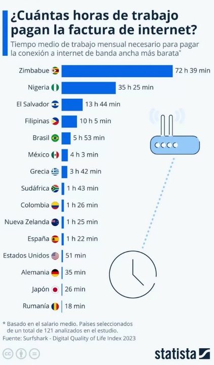 Un interesante estudio sacó a finales de octubre VPN Surfshark, que simuló las horas de trabajo que se deberían hacer en un mes para pagar la cuenta de Internet.