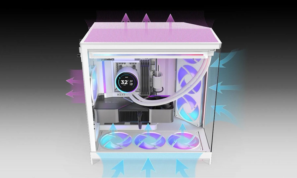 En términos simples, el flujo de aire es el movimiento de aire a través de su carcasa de un lado a otro. El aire frío se aspira desde la parte delantera o inferior, y el aire caliente se expulsa por la parte superior o trasera. Cuando se hace correctamente, esto crea una corriente de aire controlada que enfría la CPU, la GPU, los VRM e incluso los SSD o la RAM dirigiendo el flujo de aire sobre ellos antes de que se expulse el aire caliente.