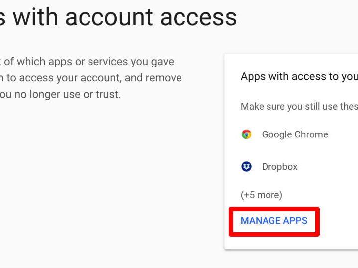 Aquí encontrarás una pequeña lista de algunas de las aplicaciones que tienen acceso a una parte de tu cuenta de Google. En algún momento, consentiste el acceso en todas estas aplicaciones, aunque puede que se aplique, o no, a tu cuenta de Gmail real. Haz clic en el enlace «Administrar aplicaciones» para obtener acceso a los permisos reales que tienen estas aplicaciones.
