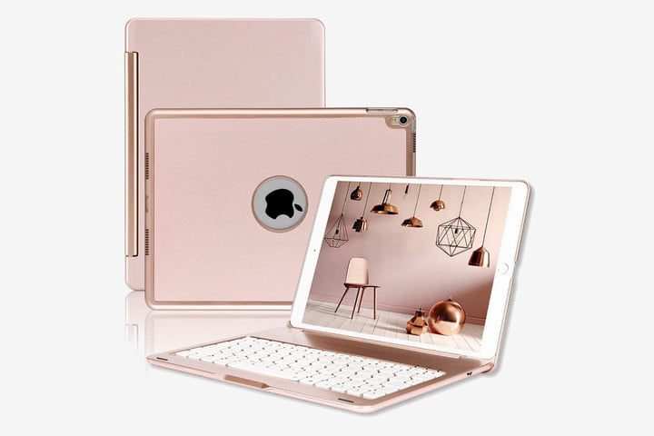 Tu iPad Air estará bien seguro en esta funda para teclado: cuenta con una cubierta de plástico con recortes en los lugares necesarios y un teclado de aluminio con teclas retroiluminadas. Tiene muchas opciones de personalización con siete colores para elegir y tres niveles de brillo. Es cómodo a la hora de escribir, pero es bastante pesado y el teclado no se puede separar de la funda. La bisagra te permite ajustar el ángulo de apertura hasta los 135 grados, y gracias a sus imanes, es compatible con la función de suspensión / activación automática. La batería le da vida hasta 180 horas de uso con una carga completa. Viene en oro rosa, negro, oro y plata.