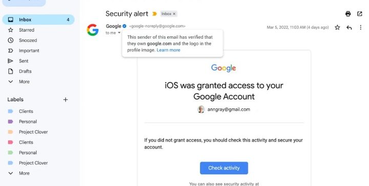 El icono es un sello azul con una marca de verificación blanca en el medio, y los usuarios pueden pasar el cursor sobre él en la web. Por ejemplo, Google dirá: «Este remitente de este correo electrónico ha verificado que posee google.com y el logotipo en la imagen de perfil. Aprende más».