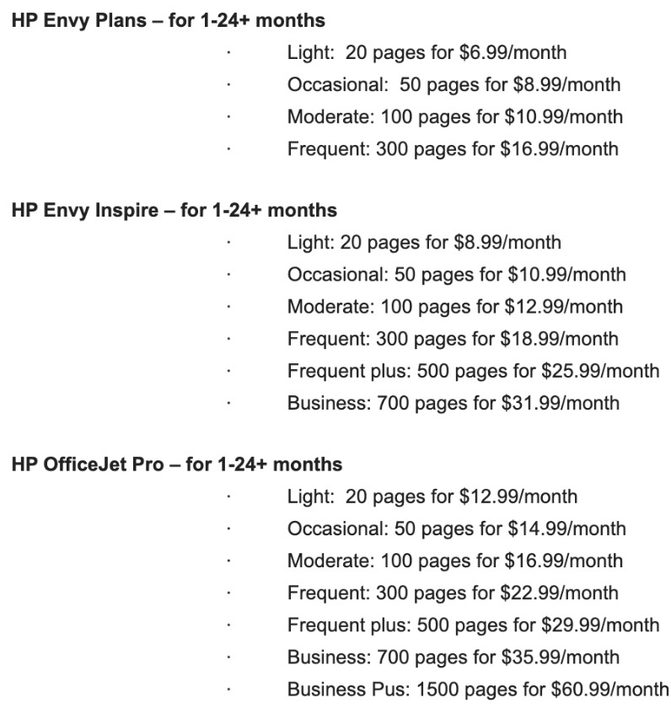 - Para imprimir páginas adicionales, tendrás que pagar más, desde 8,99 dólares hasta 60,99 dólares al mes, dependiendo de la impresora en la que te registres y de la cantidad de páginas que necesites.