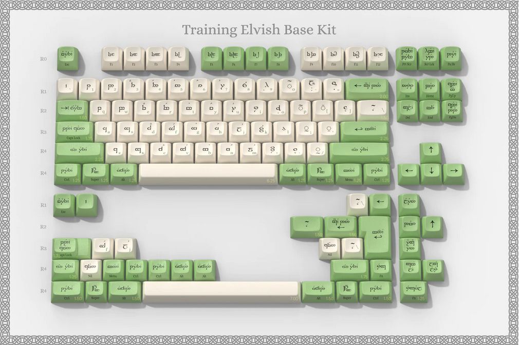 Las teclas del Elvish Keycap Set —de los elfos— están basadas en Tengwar, un sistema de escritura que fue inventado por J.R.R. Tolkien y que se usa para escribir el Sindarin, que es una de las lenguas que hablan los elfos en la película. Las teclas están grabadas con el máximo de precisión idiomática, ya que incluso aquellas que llevan una palabra como Shift o Delete tienen la traducción correspondiente.