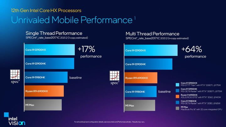 En cuanto al rendimiento, Intel dice que los nuevos chips proporcionan hasta un 17% de mejora en el rendimiento de un solo hilo y hasta un 64% de mejora en el rendimiento de varios subprocesos en comparación con el Core i9-11980HK de última generación.