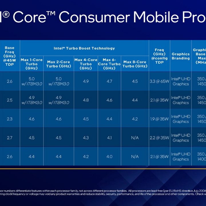 Los nuevos procesadores Tiger Lake-H están fabricados con tecnología de 10 nm, y tendrán un aumento de rendimiento de 19 por ciento respecto a la generación anterior, según Intel. El más potente es el Core i9-11980HK, que viene con ocho núcleos a 4.5 Ghz; en dos de esos núcleos se pueden aumentar la frecuencia de reloj hasta 5 GHz.