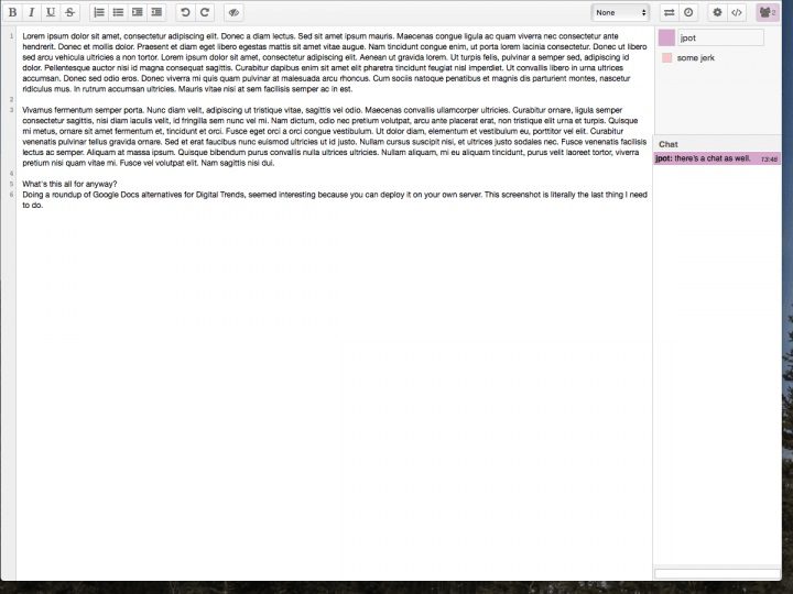 Etherpad no es una alternativa completa a Google Docs porque se enfoca completamente en la edición de textos. No cuenta con app de hoja de cálculo, app de presentación, ni compatibilidad con documentos de Word y Libre Office. Si deseas contar con estas funciones, Etherpad no es una alternativa viable a Google Docs. Sin embargo, Etherpad es una opción sólida si sólo quieres usar tu nevagador y colaborar en texto formateado en tiempo real.