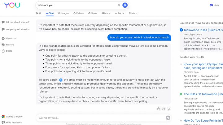 You.com ha sido una alternativa de búsqueda poco conocida en Google desde 2021, pero también ha sido uno de los primeros pioneros en implementar texto generado por IA en sus productos. YouWrite permite que una AI escriba texto específico para ti, mientras que YouChat es un clon más directo de ChatGPT. Incluso hay funciones de You.com para la codificación llamadas YouCode y la generación de imágenes llamadas YouImagine. Todos estos programas se basan en los modelos GPT-3 de OpenAI (excepto YouImagine, que usa Stable Diffusion). Eso significa que es bastante hábil para generar texto creativo o responder preguntas complejas. Desafortunadamente, eso significa que no es tan útil como ChatGPT, que actualmente se basa en GPT-3.5.