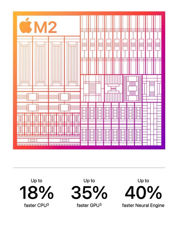 El chip M2 tiene avances tanto en el rendimiento como en la eficiencia de los núcleos que brindan hasta un 18 % más de rendimiento multiproceso que M1 con el mismo nivel de potencia. La GPU tiene hasta 10 núcleos de gráficos y ofrece un rendimiento un 35 % más rápido.