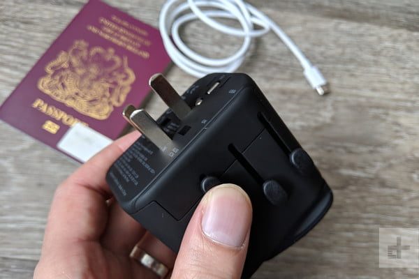 Para cambiar entre los tipos de enchufes, presiona y desliza uno de los tres botones, cada uno de los cuales se bloquea firmemente en su lugar, o puedes sacar la sección compacta del enchufe europeo. Conecta tu gadget al otro lado y todo está listo.