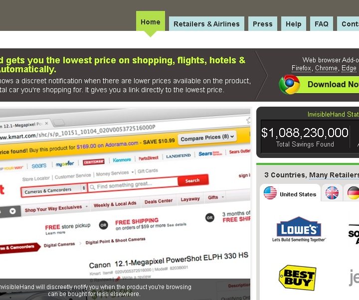 InvisibleHand es una extensión de navegador web que te notifica si un producto o vuelo que estás cotizando está disponible a un precio más económico en otro minorista o sitio de viajes a través de una notificación cuando realizas búsquedas de productos en Google.