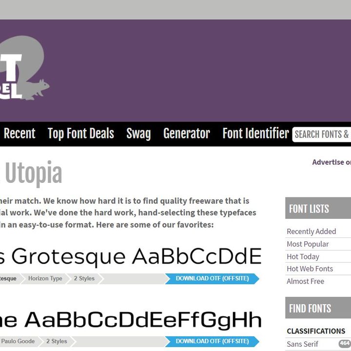 Font Squirrel es un poco diferente a las otras alternativas en esta lista, ya que lo que hace es recopilar fuentes de otros sitios web y los vincula en su plataforma. Por esa razón, no te entrega una vista previa personalizada de la fuente; para eso, deberás hacer clic y esperar que el sitio web de origen ofrezca esa funcionalidad. Por otro lado, todas las fuentes son gratuitas para uso comercial y vienen en formato OTF o TTF.