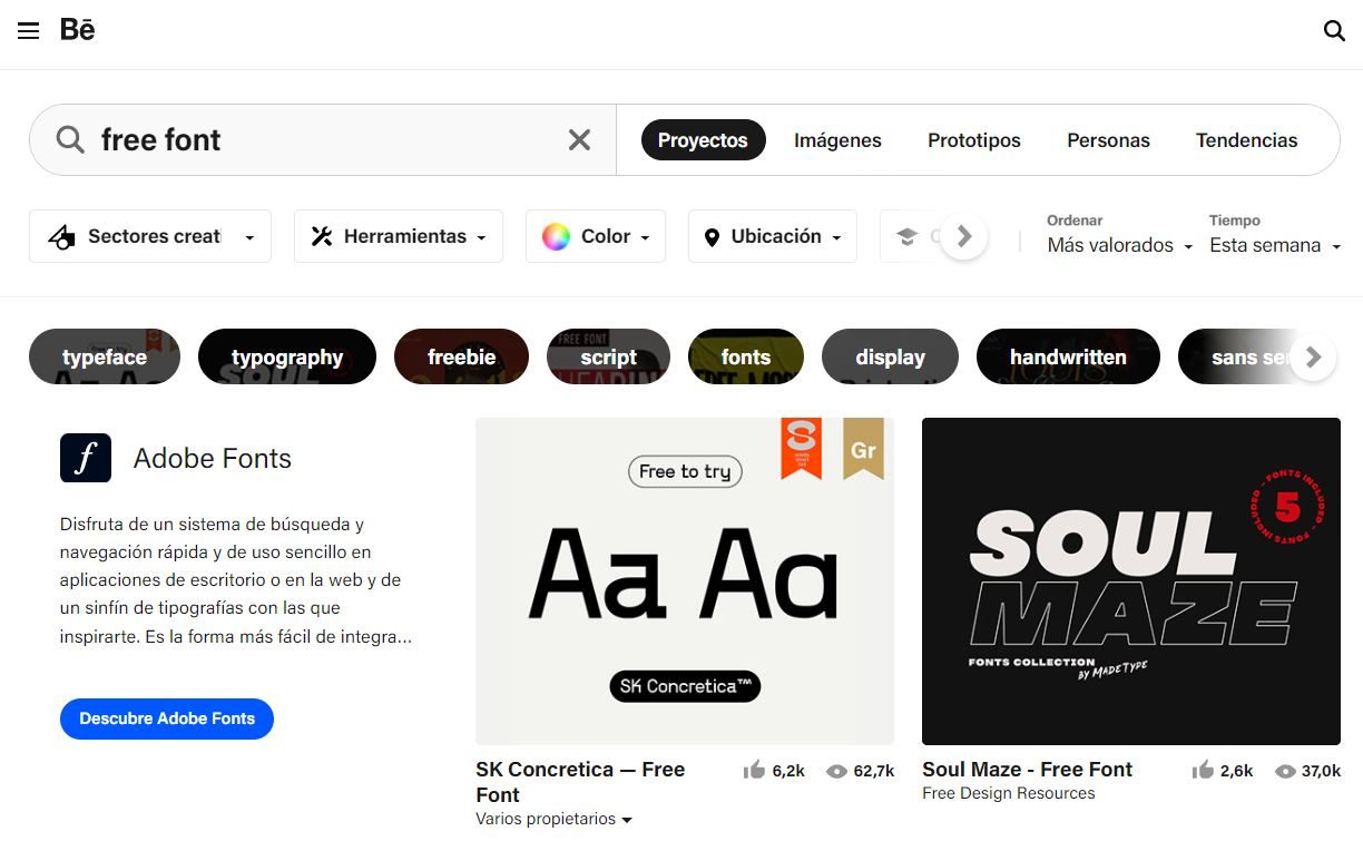 Para ello, simplemente debes buscar “fuentes gratuitas” (o “free fonts”, en inglés) en Behance. No siempre encontrarás un conjunto completo de fuentes con múltiples versiones, pero definitivamente hallarás algo que llame tu atención. De cualquier manera, es la mejor opción en caso de que necesites opciones para un proyecto de diseño gráfico, ya que encontrarás fuentes relacionadas con logotipos, afiches para redes sociales, etc.