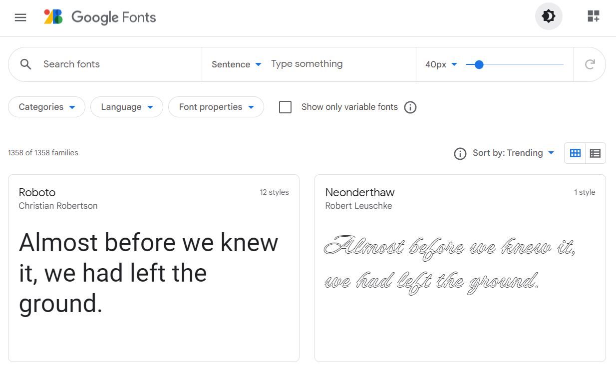Google Fonts tiene una de las mayores colecciones de fuentes listas para la web, con más de 1,300 familias de fuentes diferentes en su sitio. Puedes filtrar las búsquedas por categoría, idioma, popularidad e incluso atributos como grosor o ancho.