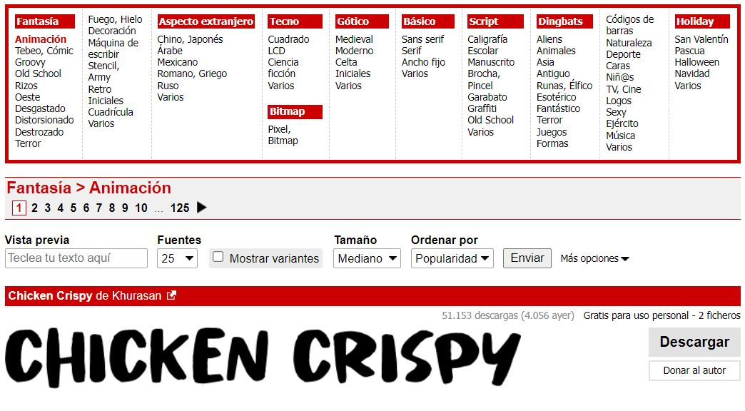 Filtrar fuentes en una colección tan grande puede ser complicado, pero para eso Dafont tiene un sistema de categorías en la parte superior. Allí puedes seleccionar una subcategoría como “Animación” o “Manuscrito”, o filtrar la lista con temáticas, como “Halloween”, “Horror”, etc. Cuando selecciones una categoría, aparecerá la herramienta Vista previa, donde puedes escribir lo que quieras y ver cómo lucirá tu texto con la fuente.