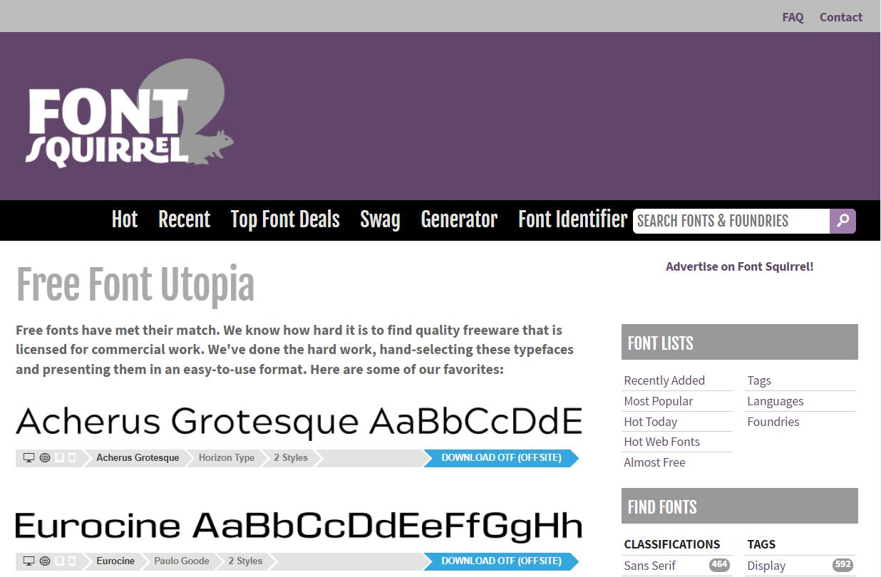 Font Squirrel es un poco diferente a las otras alternativas en esta lista, ya que lo que hace es recopilar fuentes de otros sitios web y los vincula en su plataforma. Por esa razón, no te entrega una vista previa personalizada de la fuente; para eso, deberás hacer clic y esperar que el sitio web de origen ofrezca esa funcionalidad. Por otro lado, todas las fuentes son gratuitas para uso comercial y vienen en formato OTF o TTF.