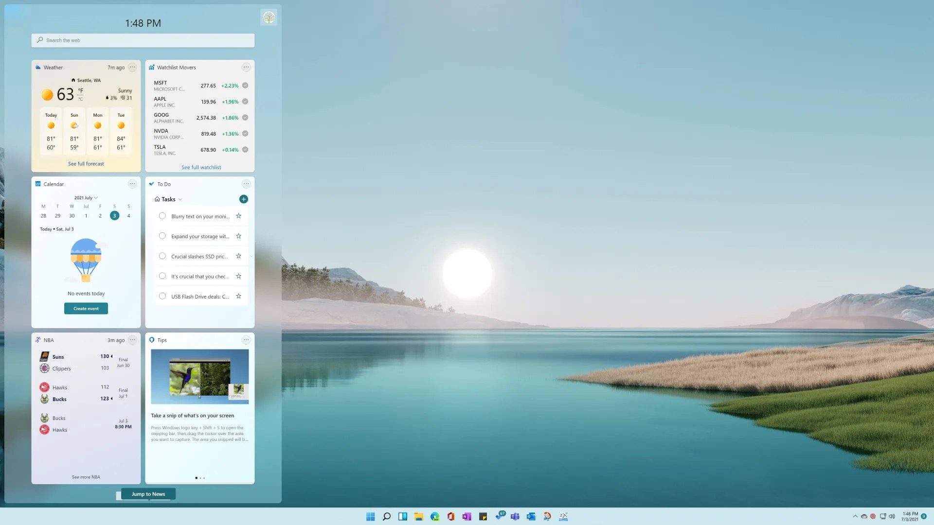 El tema predeterminado que quizás haya visto en las primeras capturas de pantalla de Windows 11 se llama Flow. Nuestros favoritos son Glow, un paquete similar a un eclipse que recorre varios tonos, y Sunrise, que ofrece una selección de fotografías del amanecer en la tundra. Puedes encontrarlos yendo a Configuración > Personalización, luego Temas en Windows 11. Échales un vistazo a todos para ver en cuáles haces más clic.