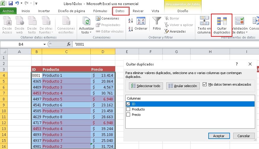 Cuando uses la opción Quitar duplicados, los datos repetidos se eliminarán de forma permanente. Además, debes considerar que se conservará el que está ubicado en primer lugar.