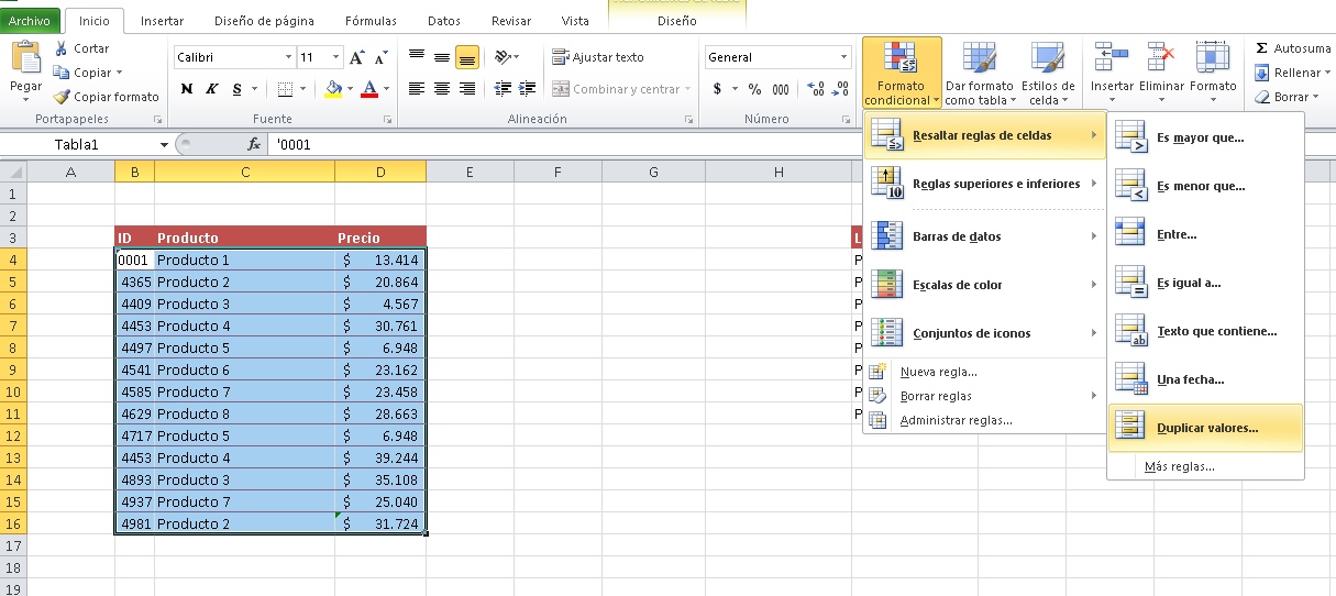 Para comprobar los datos duplicados, selecciona las celdas que deseas verificar. Haz clic en Inicio > Formato condicional >Resaltar reglas de celdas > Valores duplicados.