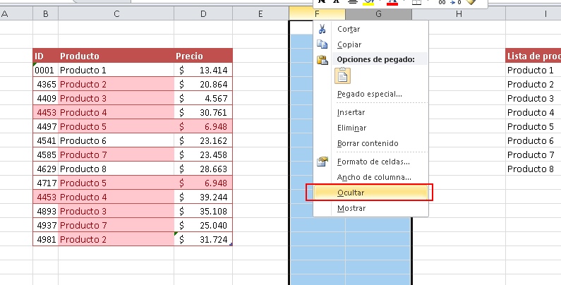 Para volver a mostrarla, solo necesitarás resaltar las columnas o filas contiguas, presionar con el botón derecho y escoger la opción Mostrar.