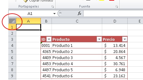 - Con el mouse: presionar la pequeña celda en la esquina superior izquierda (entre la columna A y la fila 1), como se muestra en la imagen de abajo.