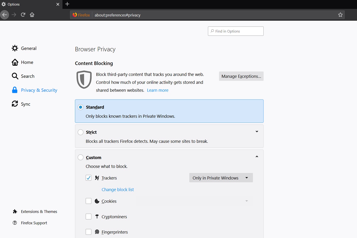 Si quieres seguridad total, puedes elegir la opción de Estricto, que bloquea absolutamente todos los rastreadores que detecte. También puedes usar la opción Estándar que te permite gozar de lo mejor de ambos mundos: un mejor desempeño y bloque de rastreadores. Además, las protecciones de rastreo de Firefox se activan por defecto incluso cuando usas su Modo de Navegación Privada.